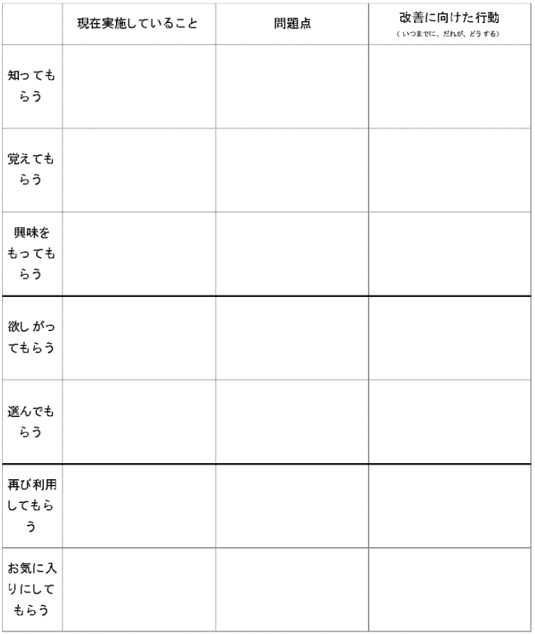 ①いま実施しているプロモーションの手段を一番左の列に書き込む